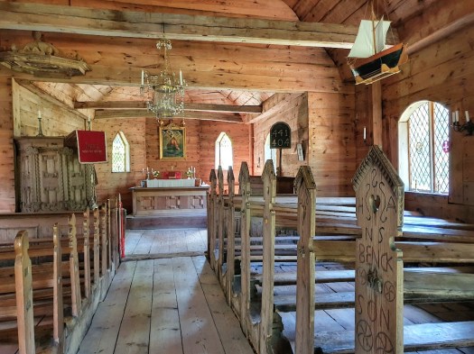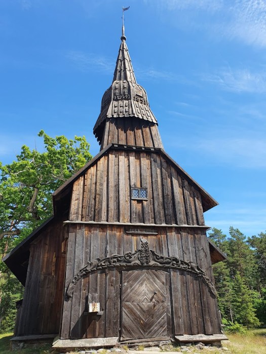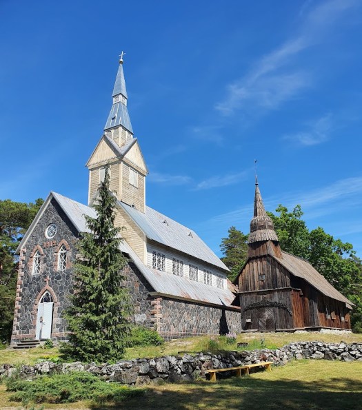 Tid för en kort upptäcktsfärd, alltså. Jag cyklar först vidare till öns båda kyrkor, som står alldeles intill varandra. Den äldre av kyrkorna, från 1644, är Estlands äldsta träbyggnad. Den har stängt för dagen, men vid den nyare kyrkan, byggd 1912, verkar någon form av förberedelser äga rum. En gubbe som jag känner igen från färjan – som visar sig vara öns präst – upplyser mig om att det ska bli konsert ikväll, med “ancient music”. Klart jag kommer!