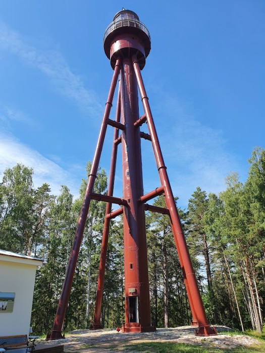 Där står en sommarjobbande kille i 14-årsåldern och väntar på mig. Han är en av öns åtta skolelever, och av honom att döma gör skolan ett utmärkt jobb. Han talar jättefin engelska, och berättar engagerat om den spektakulära fyren, från 1877, tillverkad av självaste Gustave Eiffels firma. På rysk beställning transporterades den i bitar till Runö. Bland fyrar i Baltikum är det den enda av sitt slag som ännu är i bruk. Så sent som 2021 genomgick fyren en renovering, som får den att kännas alldeles som ny. Tornet är 40 meter högt och står på Runös högsta punkt, Haubjerre, 28 meter över havet. Att nå toppen är en mäktig upplevelse. Ön känns så väldigt liten mot det stora, stora havet. Utsikten österut är treskiktad: grön skog, blått hav, och lika blå himmel.