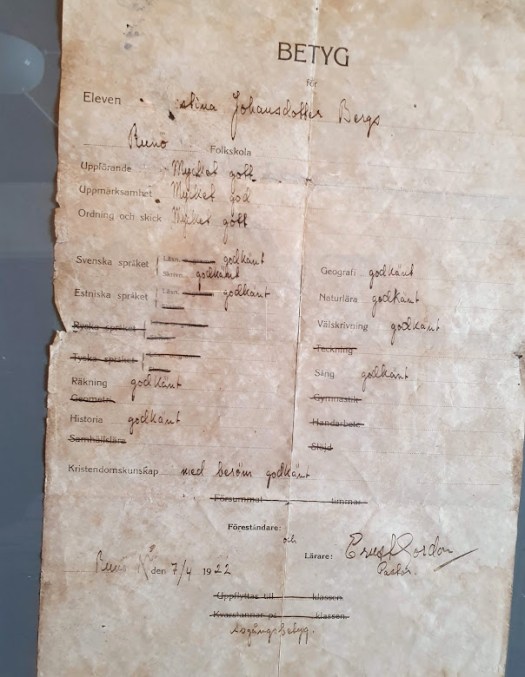 Sedan är det alltså dags för museet, som är omsorgsfullt skött. Ruth är en enastående ambassadör för sin ö. Hon välkomnar mig med ett varmt leende, och det visar sig att hon minns vårt telefonsamtal ett halvår tidigare. I en dryg timme guidar hon mig runt på utmärkt engelska och översätter utställningstexterna, som är på estniska fast vissa av föremålen de beskriver är svenskspråkiga: biblar, läroböcker, sångböcker och ett skolbetyg från 1922. På betyget är de ryska och tyska språken överstrukna, men i svenska och estniska blev eleven Lina godkänd.