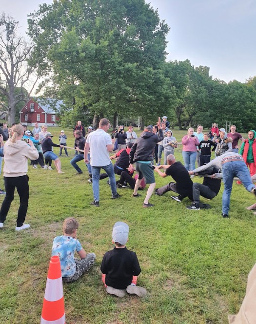 En konferencier, eller kanske ska han kallas lekledare, hojtar anvisningar inför lagindelningen, som Leif översätter åt mig. Men en fråga ställs på engelska: “Do we have any latvians here?” Den lettiska uppslutningen visar sig vara sällsynt dålig, så istället för landskamp blir det Runöbor mot fastlandsbor. Tillsammans med Leif och Susanne nöjer jag mig med att utgöra en liten svensk publik-klick.