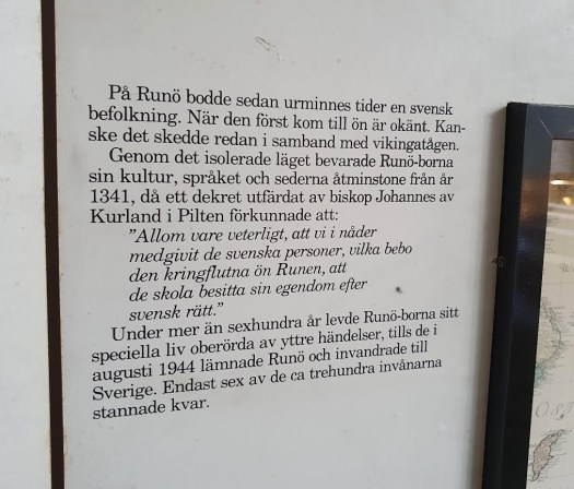 Bilden på citatet ur brevet är tagen i den nyare av Runös två kyrkor. Där finns en utställning som är helt på svenska. Jag känner igen varje ord eftersom utställningen består helt av utdrag från en bok som jag läste under mina förberedelser inför resan: Runö – svenskön i Rigabukten, skriven av Jakob Steffensson, som föddes på Runö 1924. Det är en lättillgänglig bok som är rolig att läsa, fast den emellanåt nog är ganska färgad av författarens subjektiva bild. Inget fel i det förstås, men den som verkligen vill gå till botten med öns historia bör också ta sig an Hedman och Åhlanders mer grundliga redogörelse.