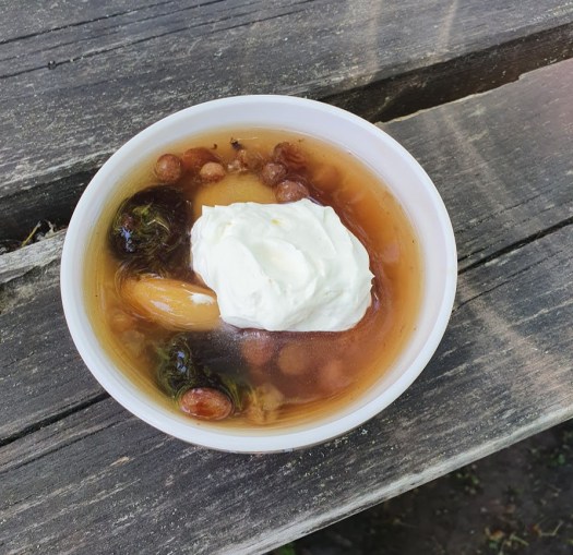Jag lämnar min väska och går genast tillbaka till cafét, som visar sig vara mer än så: de har en hel turistgrupp inhyst. Det finns alltså fler turister på ön, men som utombaltisk besökare är jag nog ensam. Till eftermiddagskaffet serveras jag en läskande rabarberlemonad från Ösel, och en efterrättssoppa som enligt den tillmötesgående tjejen kallas “babushka”, för att den är “so old school”. Den består av torkade aprikoser, plommon, russin, en klick grädde – tidlöst gott.