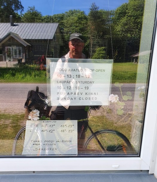 Sen sätter jag mig på min veranda, varvar ner och lyssnar på tystnaden. I öns enda affär har jag köpt två lokala hantverksöl, och en ny bok av Jakob Steffensson, som jag nu börjar läsa. Affären är öppen två gånger om dagen. På bilden här ser ni mig speglas i fönstret, när jag sittande på cykeln fotar av öppettiderna. Damen i butiken sken upp när hon förstod att jag var svensk. Hon berättade att Leif och Susanne var på plats på ön, och hoppet väcktes om att träffa dem på midsommarfesten.