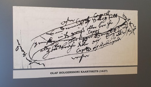 Jag börjar min redogörelse vid den tid då Runö blir en del av stormaktsnationen Sverige. (Öns ännu tidigare historia har jag redan avhandlat i del 1.) I augusti 1621 belägrades Riga av den svenska flottan. När staden efter en månad kapitulerade så innebar det att Runö, som hade styrts från Riga, tillföll Sverige. Två år senare skänkte Gustav II Adolf ön till sin halvbror, riksamiralen Carl Carlsson Gyllenhielm. Han lät genomföra en revision, som slog fast att det då fanns 18 gårdar på ön, med varsitt bondpar och 39 söner och 32 döttrar i varierande åldrar. 1627 kom inspektören Olof Holgersson Frände till ön, och ritade då den skiss över gårdarnas placering, som är den äldsta karta som finns av Runö. Bilden här är från öns museum, där en kopia av kartan finns utställd.